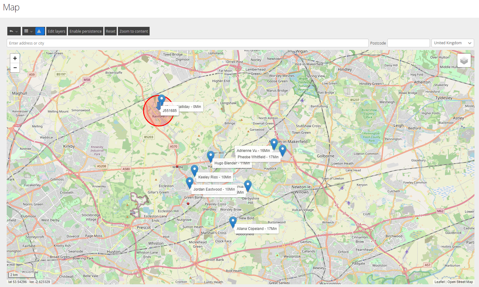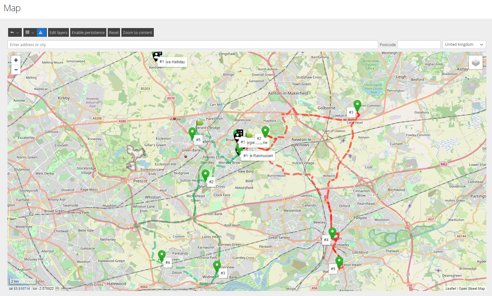 Selecting a Job (or multiple) from the Jobs view and clicking Journey will show the predicted route taken by the Workers to navigate to each customer. If selecting multiple jobs across multiple workers, these will be colour coded accordingly.