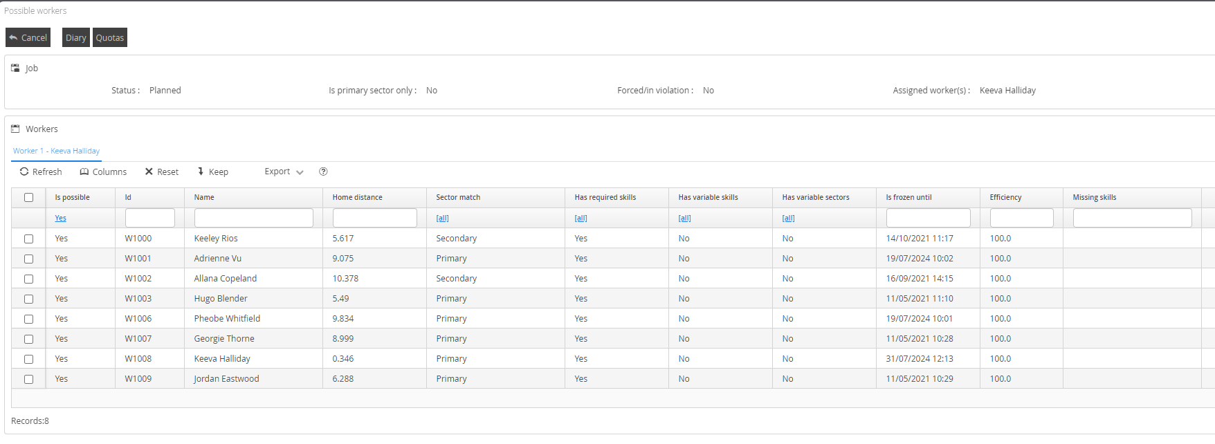 From here you can see the home distance and details around the sector and its association to the worker as primary or secondary. You also have some further information on efficiency of the workers, variable skills and planning frozen dates if used.