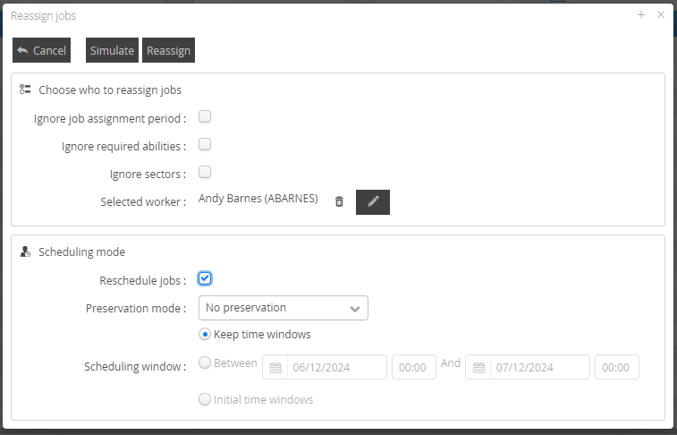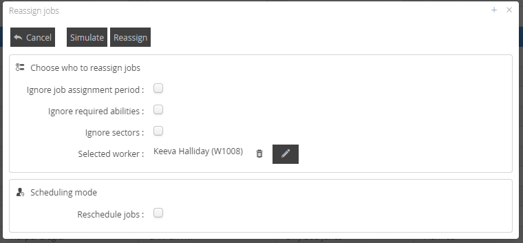 Reschedule jobs | If the option is left unticked then it will look to move to the selected worker with no change to the time scheduled. |