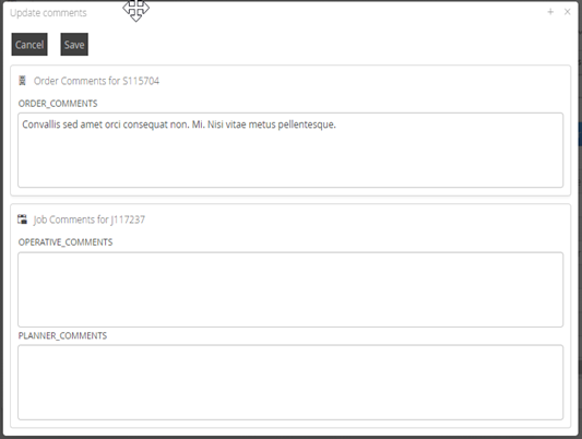 Order Comments | Associated to the overarching order and usually the description of the work applied in the back office system. Amending this will amend the order comments across all Jobs in the system as well as the overarching order. |