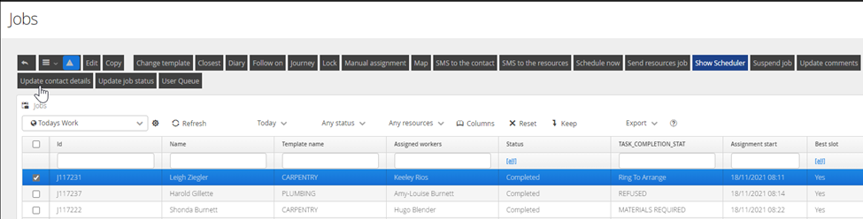From the Jobs view, select the job and click on the Update Contact Details button.