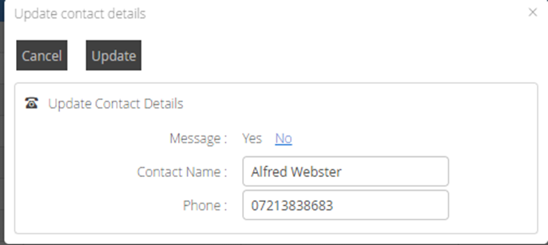The update contact details pop up box will appear, amend the details for contact name and phone number as required, confirm if a text message is required by selecting Yes or No and click update.