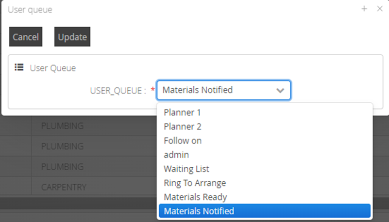 The user queue pop up box will display, from here select the user queue required from the list of options and click on Update to apply.