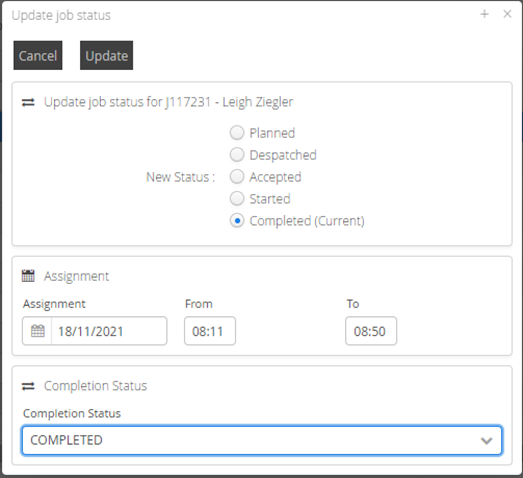 If Completed is selected you can amend the dates/times associated to the job for accurate start and completed times, you also need to select a completion status from the available options.
