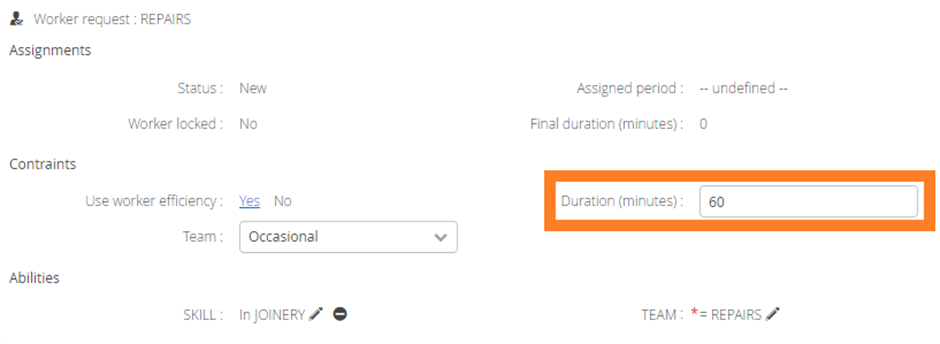 On the Job screen, you'll find the Duration(minutes) within the Worker Request section.