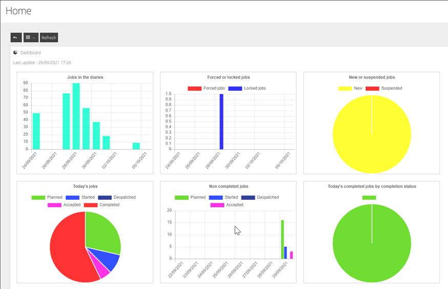 The DRS Home Screen contains charts that can highlight important details within your solution. These charts do not allow the user to drill down but are designed to provide a quick point of reference at the point of login for anything they may want to immediately follow up on.