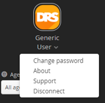 Underneath the DRS Logo, you will see your current logged in Username. Selecting the username will enable users to change their password, disconnect, change language, and view the about details for the application.