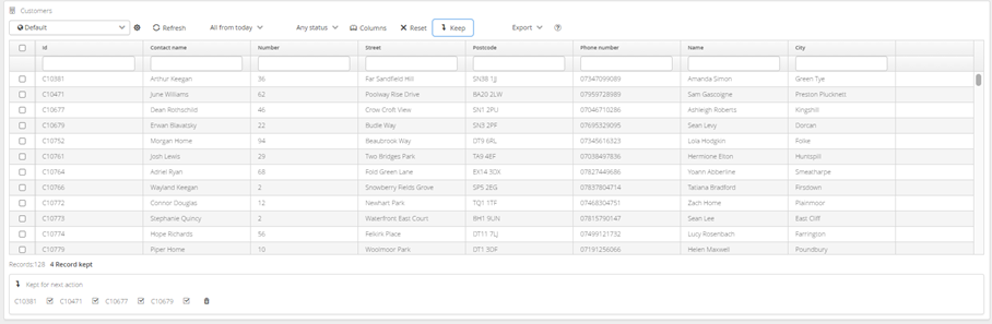 The Keep List can be cleared by clicking the Trash Can or individual items can be removed by clicking on the individual ticks next to the items in the list, this function works largely in the same way for all screens where it appears. These items can be used to interact with other functions such as Maps, Filtering, Schedule Now, Lock etc.