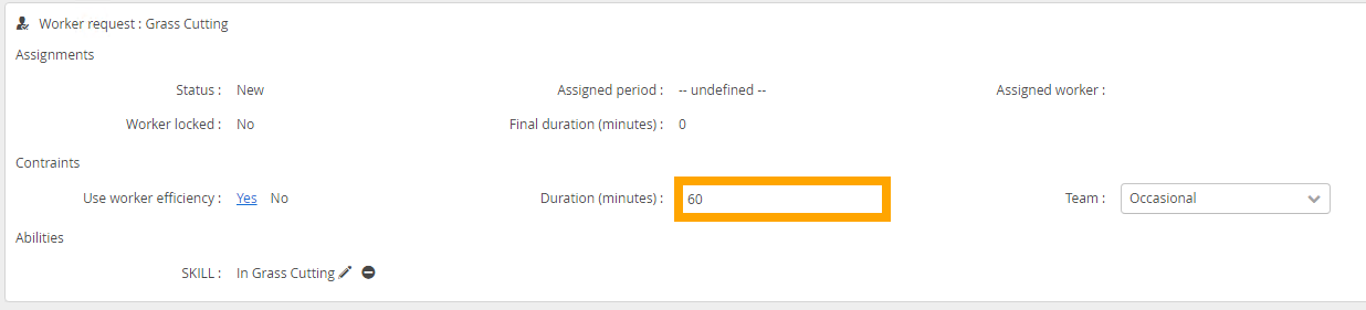 Scroll down to the worker request region and check the job duration. This will be the duration assigned to each job, i.e. each grass cut. If its incorrect you can change it.