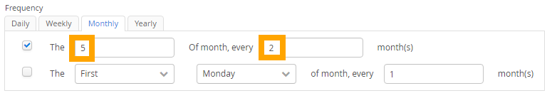 Monthly using day numbers. The below example will create a job for the 5th of every second month: 5th March, 5th May, 5th July etc.