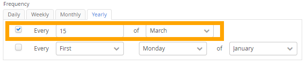 Yearly using day numbers. The below example will create a job for the 15th of March, every year.