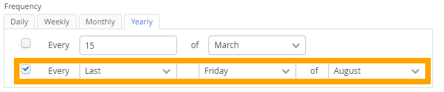Yearly using day names. The below example will create a job for the last Friday of August, every year.