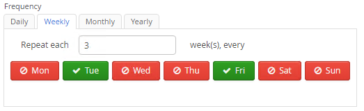 Weekly. The below example will create a job for both Tuesday and Friday every 3rd week: 18th and 21st March 2025, followed by 8th and 11th April 2025 etc.