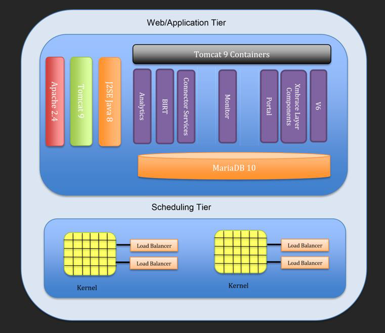 The web tier serves a number of purposes one of which is the web user interface accessed via a web browser. The web application communicates with the DRS scheduling server where the Kernel(s) reside.