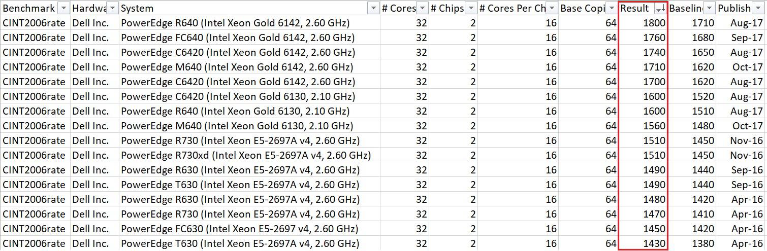 The example query below brings back the Specint result for all Dell dual socket processors which have a total of 32 cores. You can export this to a CSV file and sort by result.