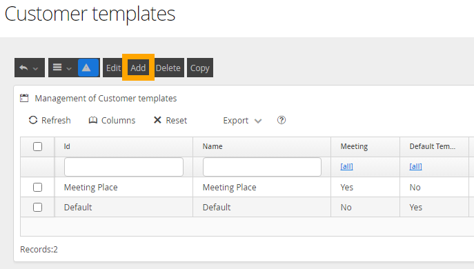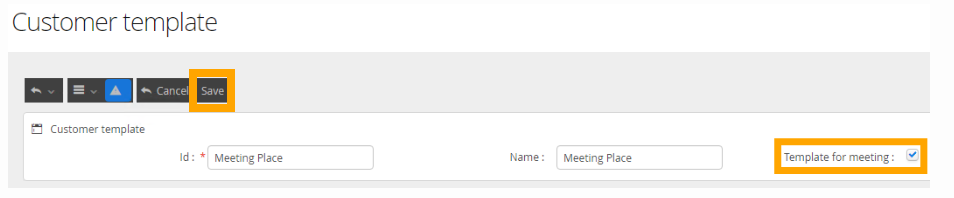 Give the meeting customer template a unique ID and name, tick template for meeting, then click Save.