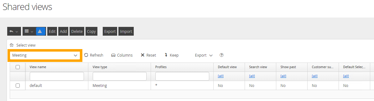 If a view called 'default' already exists, select it and then click Edit, change its configuration to suit your business needs as required. If required, multiple Meeting Room views can be configured to suit your business and user needs.