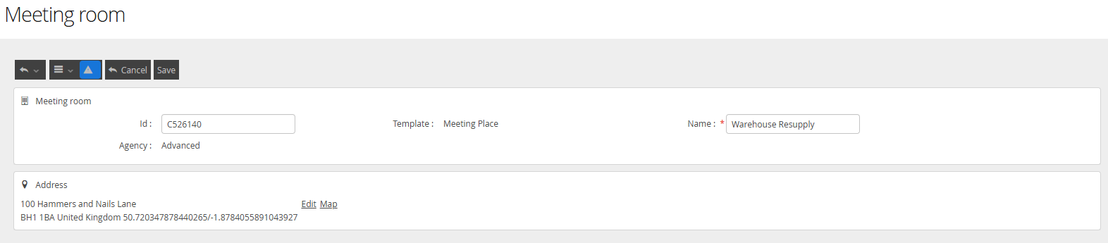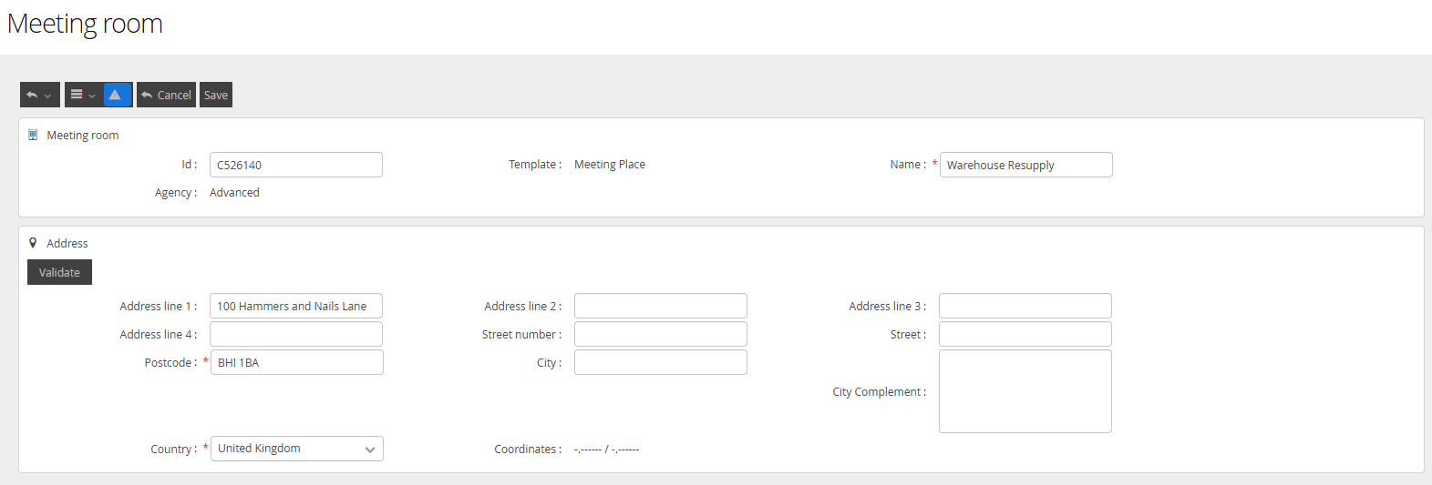 Give the meeting room a ID and Name, enter the address, including valid Post Code, and click Validate.
