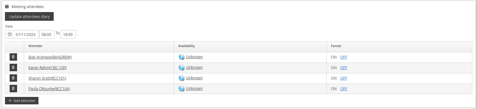 From here, you can check the availability of the attendees by clicking Update Attendees Diary. This will display the required workers availability for you to review.