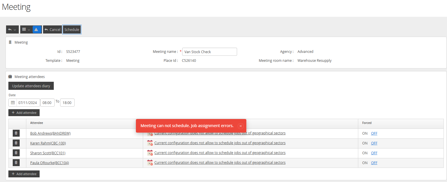 If your workers and diaries allow for the meeting to be scheduled in, the jobs will appear within the attendees diaries. If not, you may see a similar error to this one;