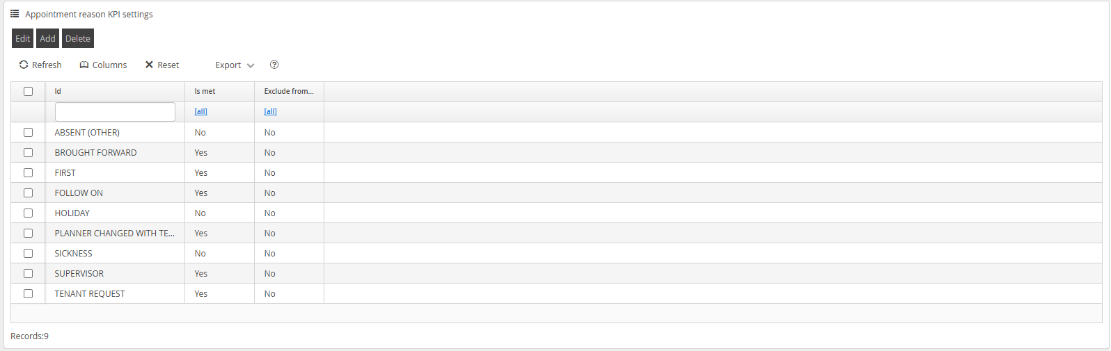 The Appointment Reason KPI Settings provide the opportunity to identify tasks which at the point of schedule identify whether the task itself has the potential for the appointment to be "Met".