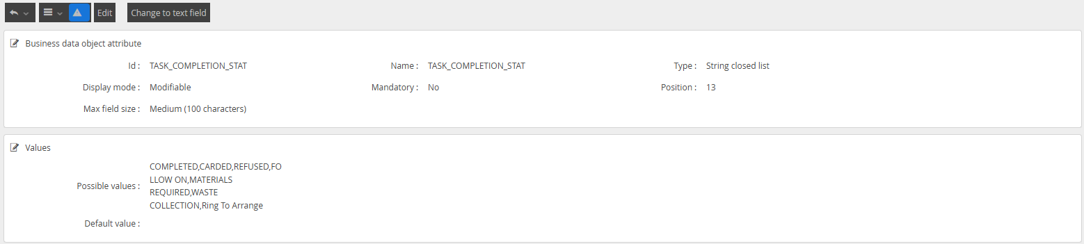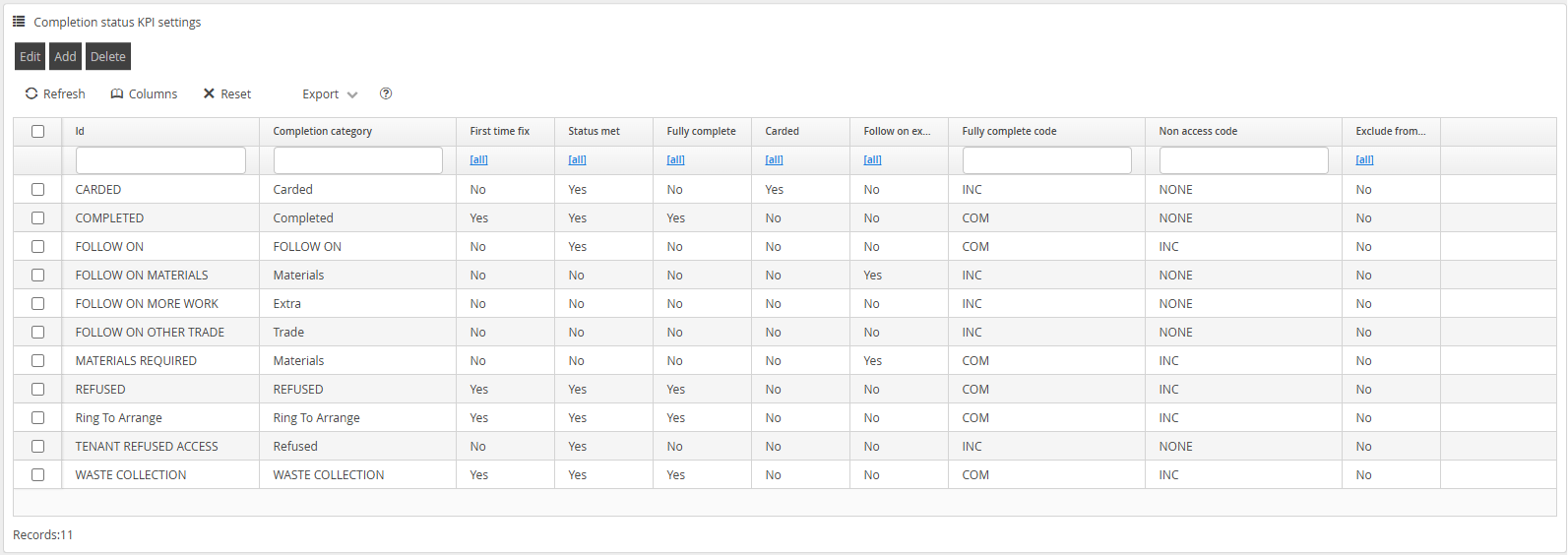 No Access Code | This is a mandatory field that you can use to organise different types of Completion Reasons together for reporting aggregation. This is a free text field. | Free Text | NOAC, TENANTREFUSE |