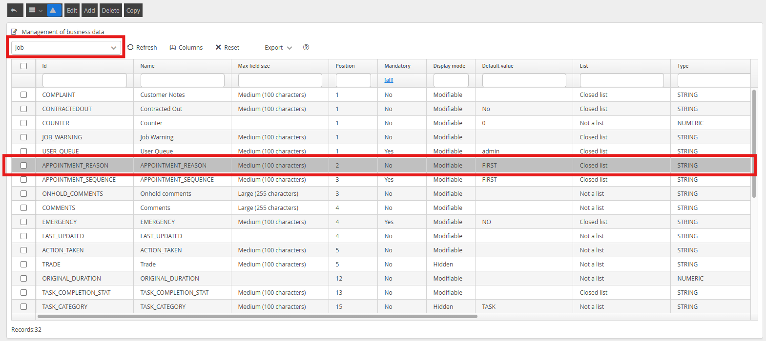 Navigate to the Job list of Business Data, and select the APPOINTMENT_REASON data item.