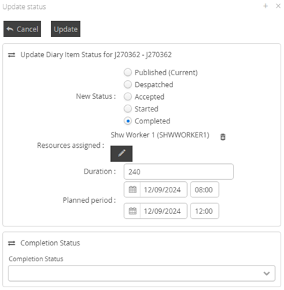 This function performs in the same way as the standard Update Status job modal, including when Completed is selected, where the option to update the Completion Status will be displayed