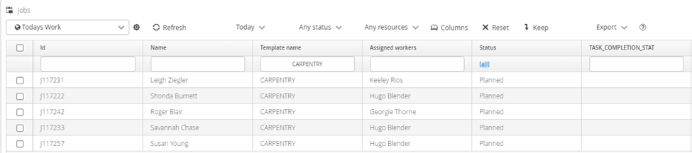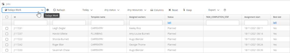 Data can be filtered by selecting an option from the VIEW combo box. These combo boxes are available on all of the Main object pages, (eg. Customer, Order, Job, Worker, Project). The various options across the top of the View pane allow the user to control the display of data for various common data themes, such as Time Period, Status and Assigned Resource.