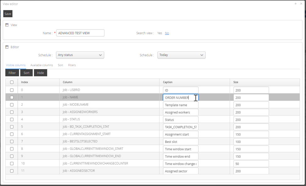 Selecting Save, or Save As will open the View Editor Screen where you can introduce additional columns, provide a name for the view, change column sizes and allow you to apply filters, sorting and rename the column headings