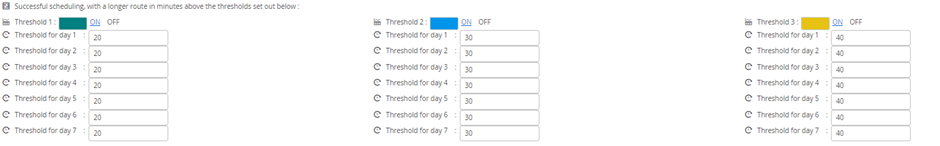 Thresholds can be toggled on or off. If they are on, then they require the thresholds to be set for each day. These are minute values and can be different on each day. As the Thresholds are designed to be a visual indicator, each subsequent threshold should be greater than the last.