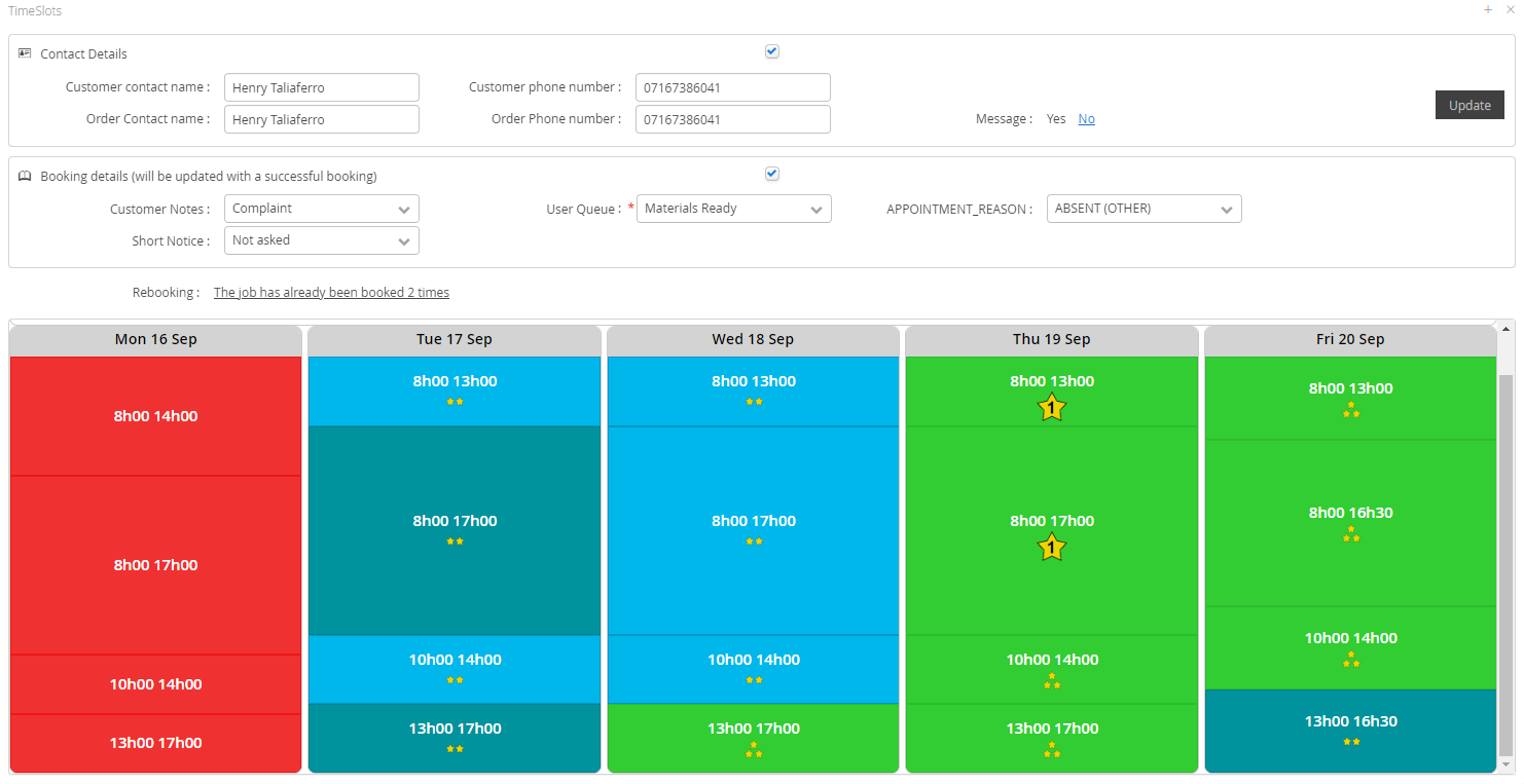 - Failed Scheduling (Red) - These are slots within the Time Window of the job however there is no capacity within the diaries to plan them in and therefore not possible to be scheduled into.