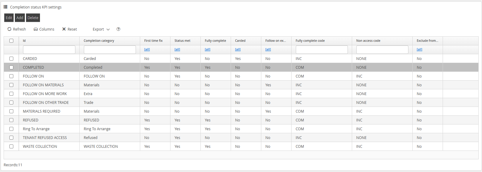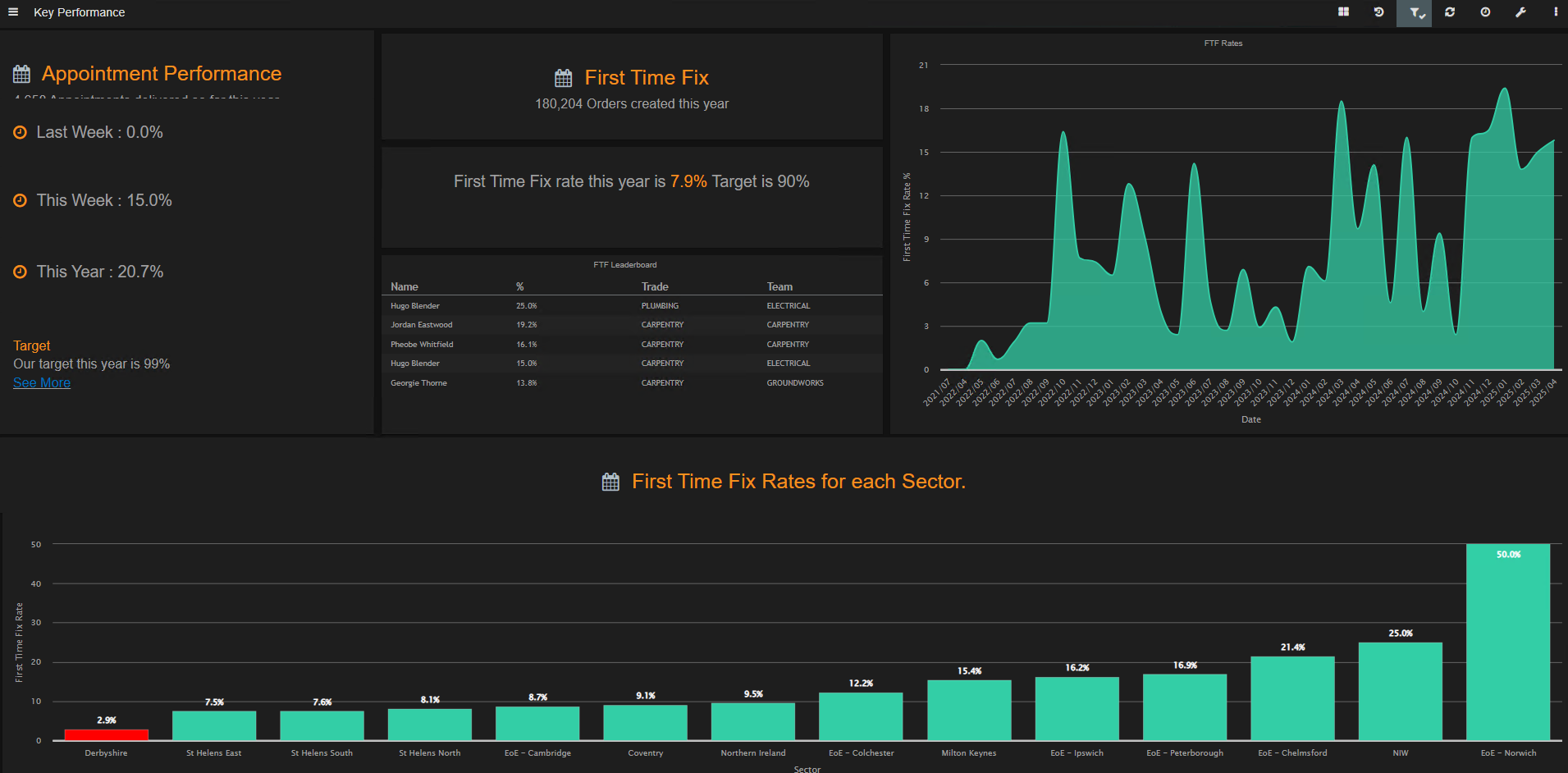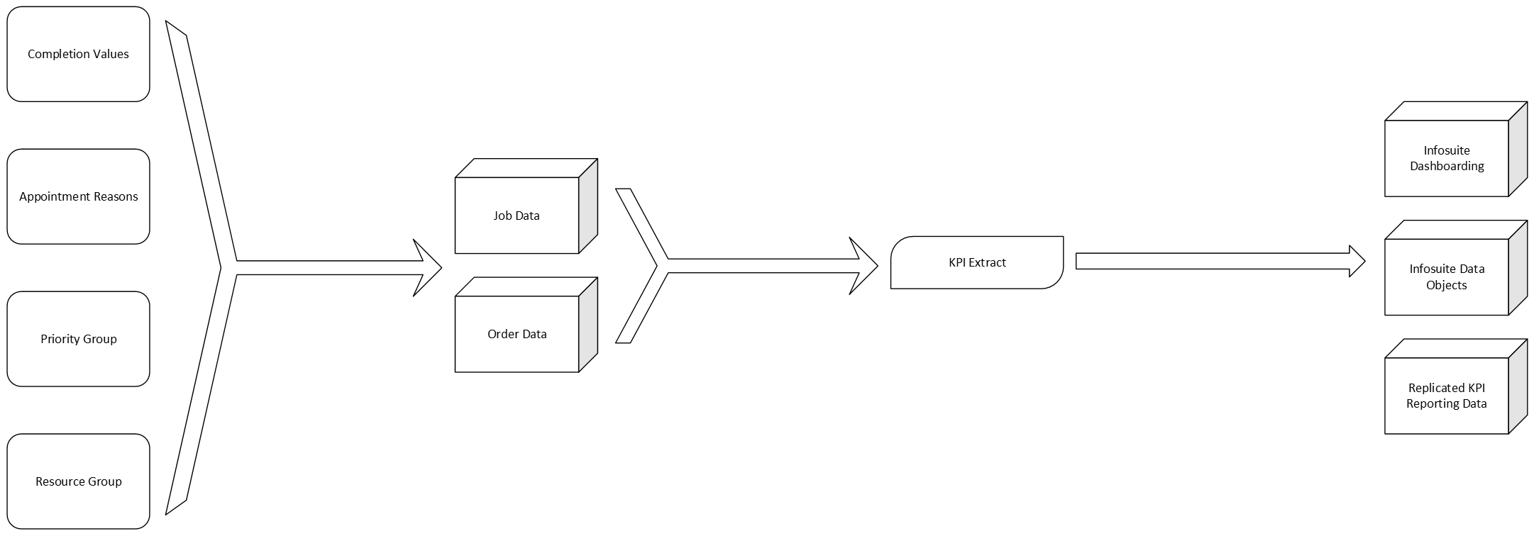 The KPI Extract is a function within DRS which creates a user configurable reportable dataset within the database. This reporting dataset can be accessed via the replicated database, or through using Infosuite. By configuring the various options within the KPI menus, you can customise the way DRS calculates key metrics such as Appointments made and kept and First Time Fix. These values are then used within various Infosuite reporting dashboards and charts to help you keep track of your delivery quality.