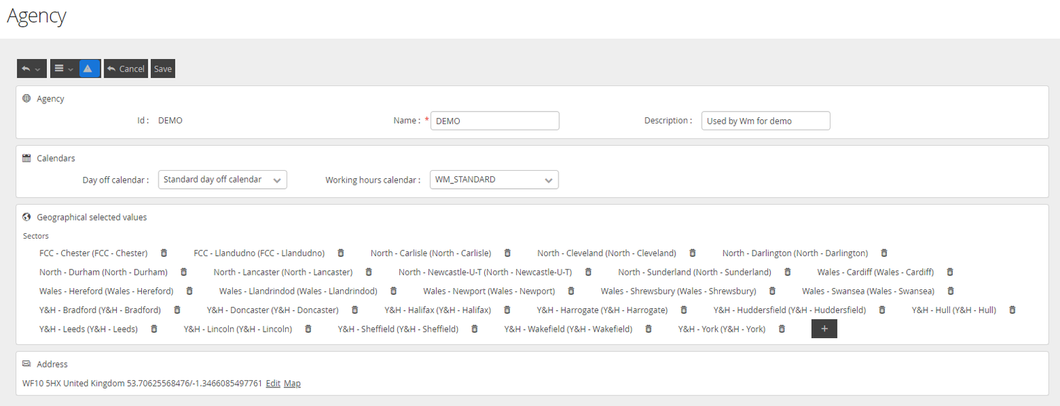 Address | This address is usually the head office of the Agency, but can be any address that makes sense to you. You can edit this by clicking the Edit button. The address only requires the Postcode and Country fields to be completed. DRS utilises Postcodes in its scheduler logic. The rest of the address lines can be added if needed. In order to be saved, the postcode and Country need to be valid and confirmed by clicking the Validate button. Clicking the Map button will allow you to add and view the address on a map. |