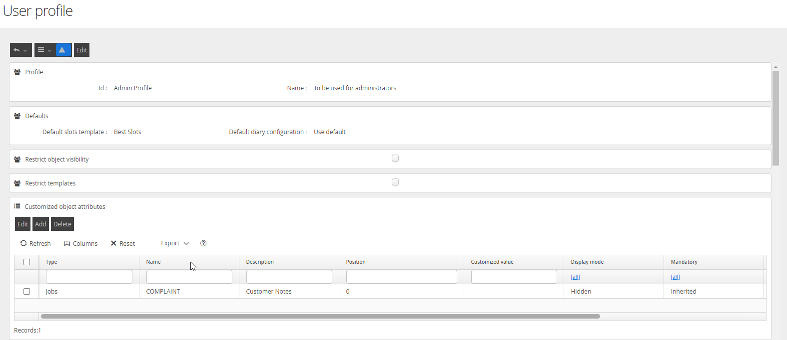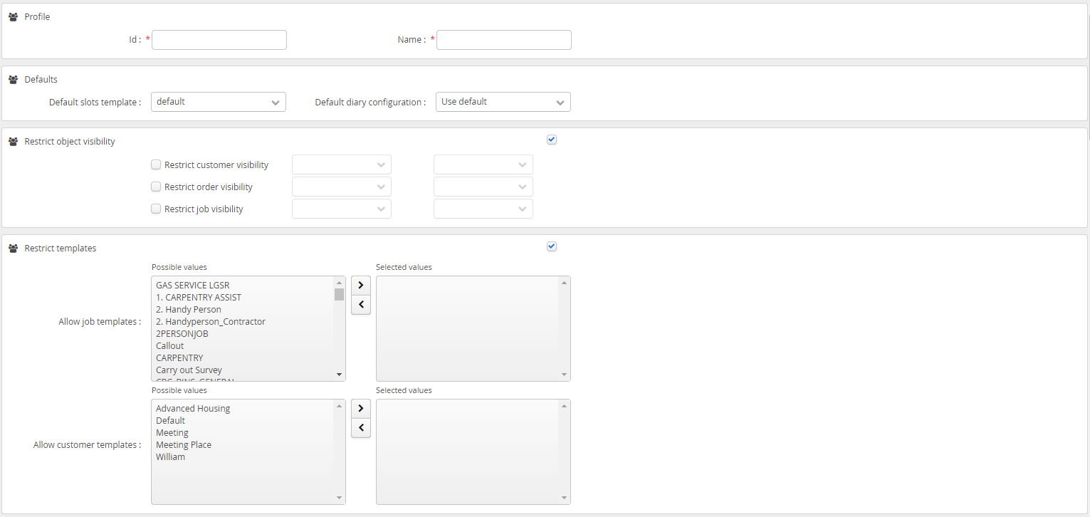 Defaults | Default diary configuration | Setting a Default Diary Template against the may change the Slots Template offered to the user who is assigned this Profile. Refer to the article on Object Inheritance as to the order in which inheritance is applied |