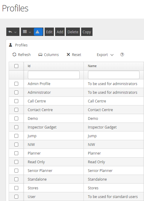 Selecting the Profiles option from the User and Profiles menu in the Configuration Zone in DRS will display all current Profiles configured in your system.