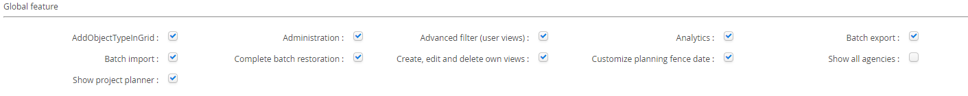 The Global Features section determines what parts of the system a user can interact with where these items are typically accessible in multiple parts of the application. Notably within this section is the ability to allow access to the Administration zone of DRS.