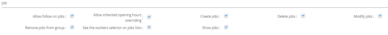 The Job section determines the users ability to perform tasks related to Job objects. Notably in this section is a permission 'Remove Jobs From Group', which is a specific function deployed for very high volume customers to ensure scheduling optimisation continue at performant speeds.