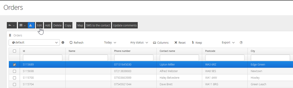 Select an Order by placing a tick in the check box and selecting edit (or by right clicking your mouse on the entry), this will take you back to the Order Details screen for amendments to be applied, once done click save.