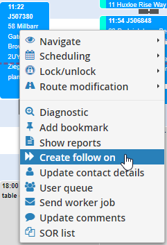 Follow Ons in DRS can be used to create additional appointments linked to the original task. This can be performed from the Diary or the Job List screen. To create a follow on from the Diary, right click on the job in question in the diary and select Create follow on (alternatively you can search for the job and open it and click the create follow on button at the top of the screen).