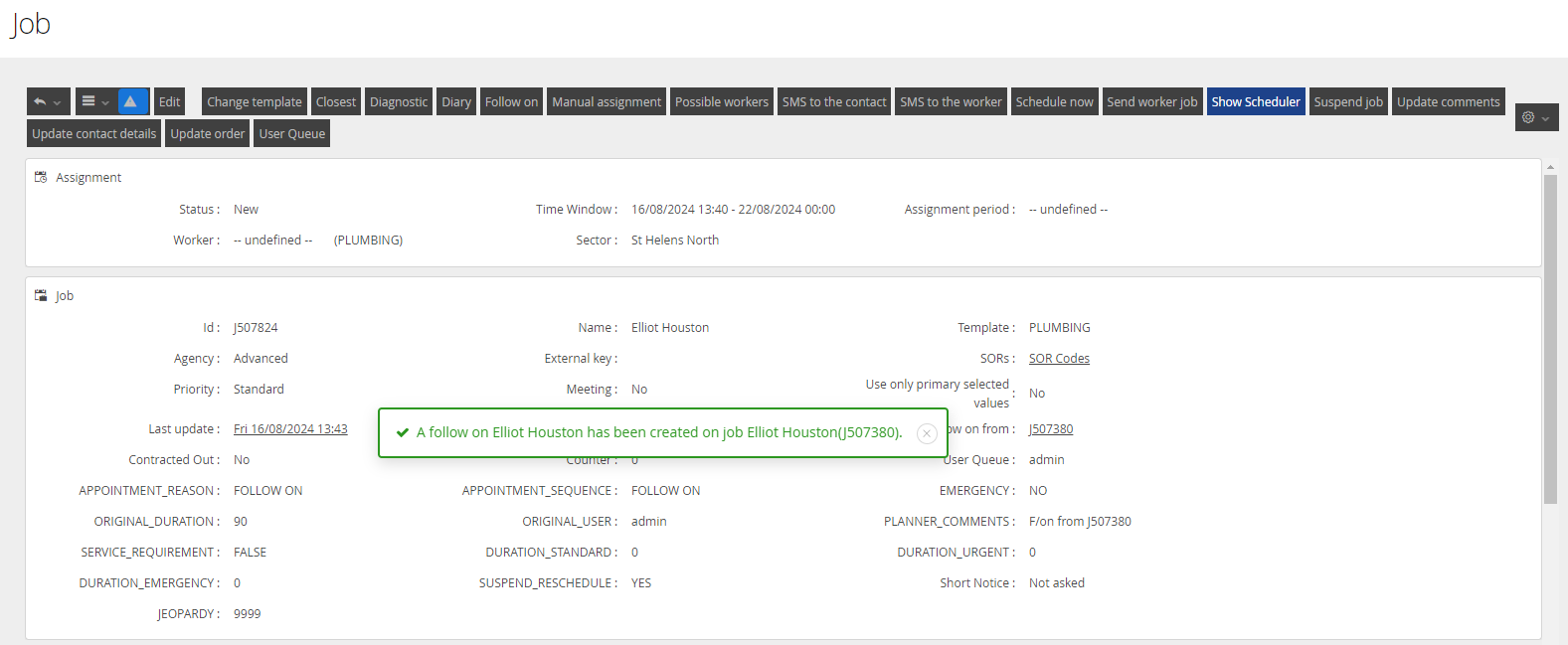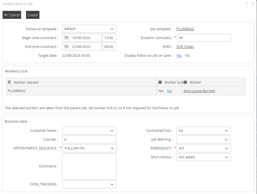 Job Template | This can be changed if a new skillset is required for the follow on appointment. For example the completion status of the previous job could have been ASSISTANCE REQUIRED therefore a Paired Template would be required for the follow on Job. Changing this will change the resource request section |