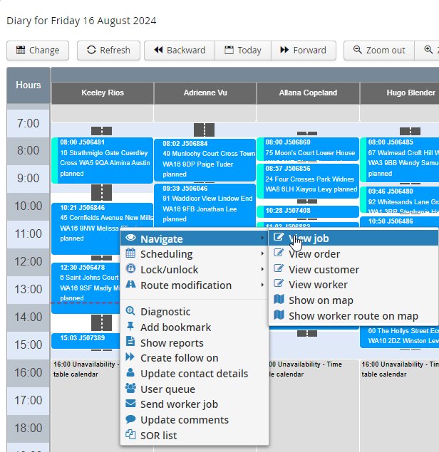 Even more information on each job can be accessed by going to the Job Details screen from the various places around the solution. From the diary, right click on the Job and select Navigate> View Job