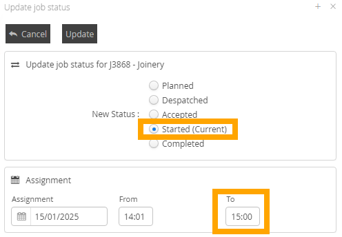By the default, the next status in the job life cycle (i.e. Completed) will be selected. Set this back to Started and enter the expected completion time beneath, then click Update.